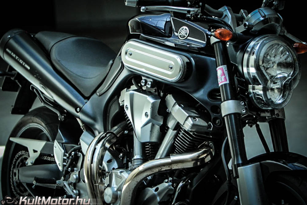 Ennek a motornak olyan blokkja van - nyilván ez is formatervezés eredménye - amit a motorok iránt végleteik közömbös emberek is megnéznek. Nekem a nyálelválsztásom megindul egy klasszikus japán sornégy léghűtéses hengereitől és króm leömlőitől, ami pont hidegen hagyja az átlagembert, de az MT-01 blokkja még őket sem, mert egyszerűen brutális.