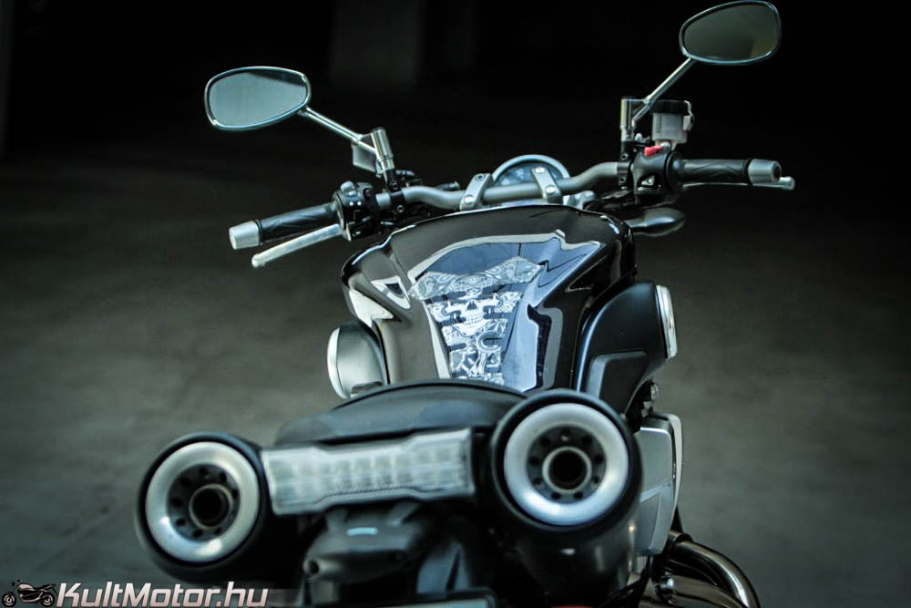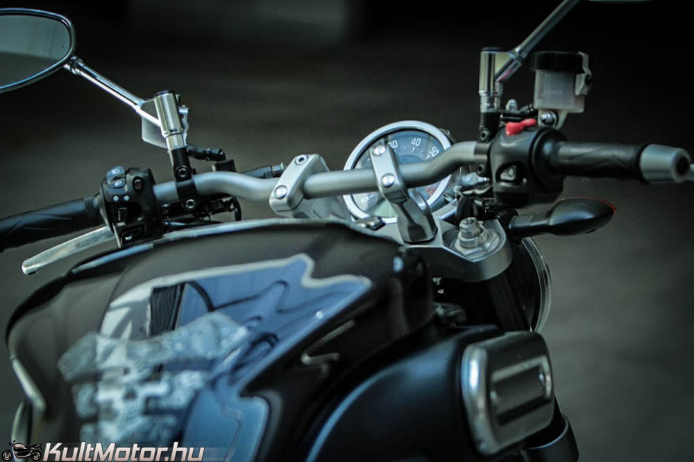 Trendi fatbar kormány van a motoron, ami viszonylag egyenes testhelyzetet eredményez, de autópályán pont úgy rá tudtam hasalni, hogy a menetszél a könyökeimet támasztotta. Sokkal de sokkal barátibb gyors haladásnál a saját Yamaha XJR 1300-omnál, aminek háromajtós szekrény légellenállása van és a V2 is szórakoztatóbb. Nem sokat autópályáztam vele, de amikor meg kellett tennem 220 kilométert, meglehetősen könnyedén ment, pedig igencsak rühellem az autópályát.
